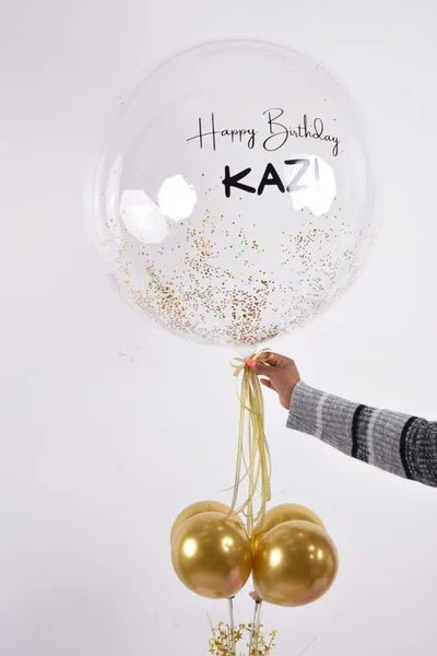 Personalized helium bobo balloon with a gold balloon holder and 4 latex balloons!