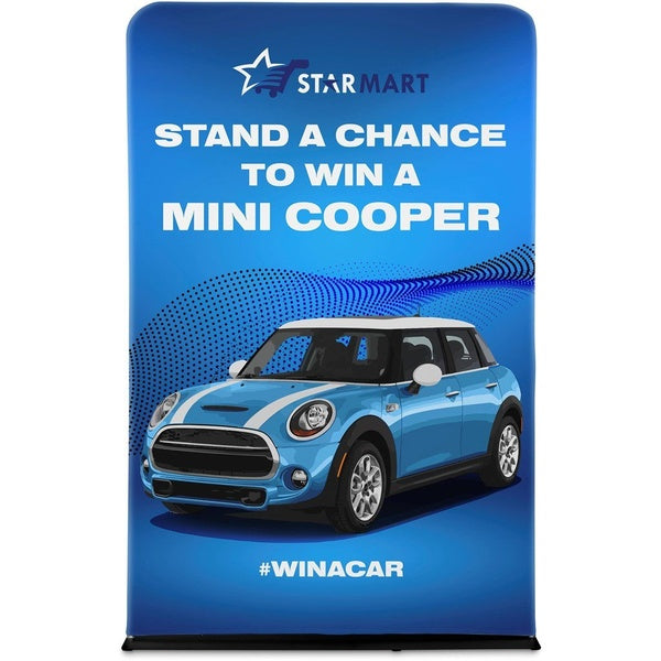 This display features a full-colour digital dye-sublimation print on 230 g/m² polyester fabric, with the fabric joined and hemmed for added strength, ensuring a durable and professional-looking finish.