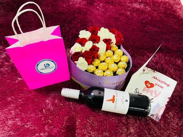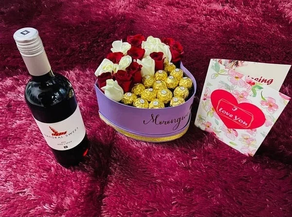 My Darling Rose Hamper is a great gift for any occasion. It includes a personalized card, a bottle of wine and an elegant arrangement of red and white roses. Complete with Ferrero’s, this gift set is sure to make a special someone feel loved.